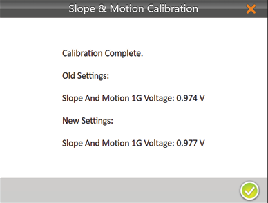 Slope and motion calibration establishes the 1G voltage for the accelerometer inside the GrainGage. This calibration is critical for good weight measurements on the moving combine. It should not need to be calibrated more than once a year.