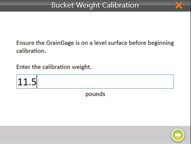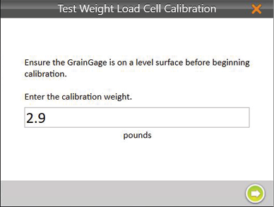 Use the weight calibration wizard and the larger weight (11 lb (5 kg)) included with the GrainGage to calibrate the weigh bucket load cells.