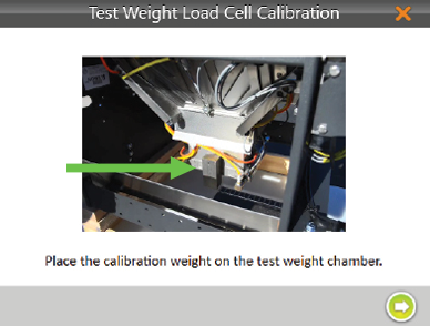 Use the test weight load cell calibration wizard and the smaller calibration weight (3 lb (1.4 kg)) included with the GrainGage to calibrate the test weight chamber load cell.