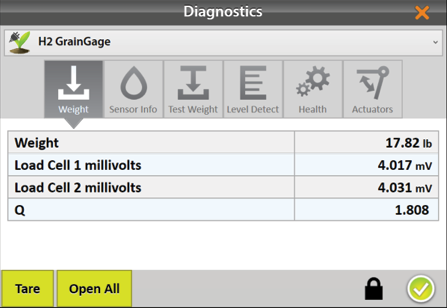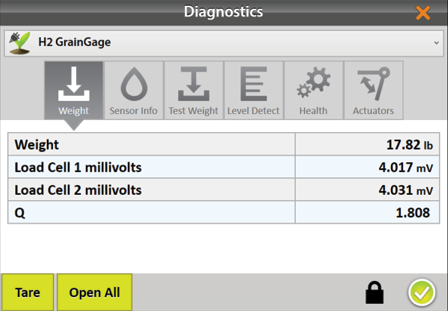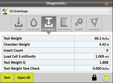 - The Diagnostics box should report a reading that is very close to the value stamped on the calibration weight. If it’s not within .05 lb (23 g) when the combine and thresher are on and .02 lb (9 g) when the combine is off, HarvestMaster recommends a new weight calibration.