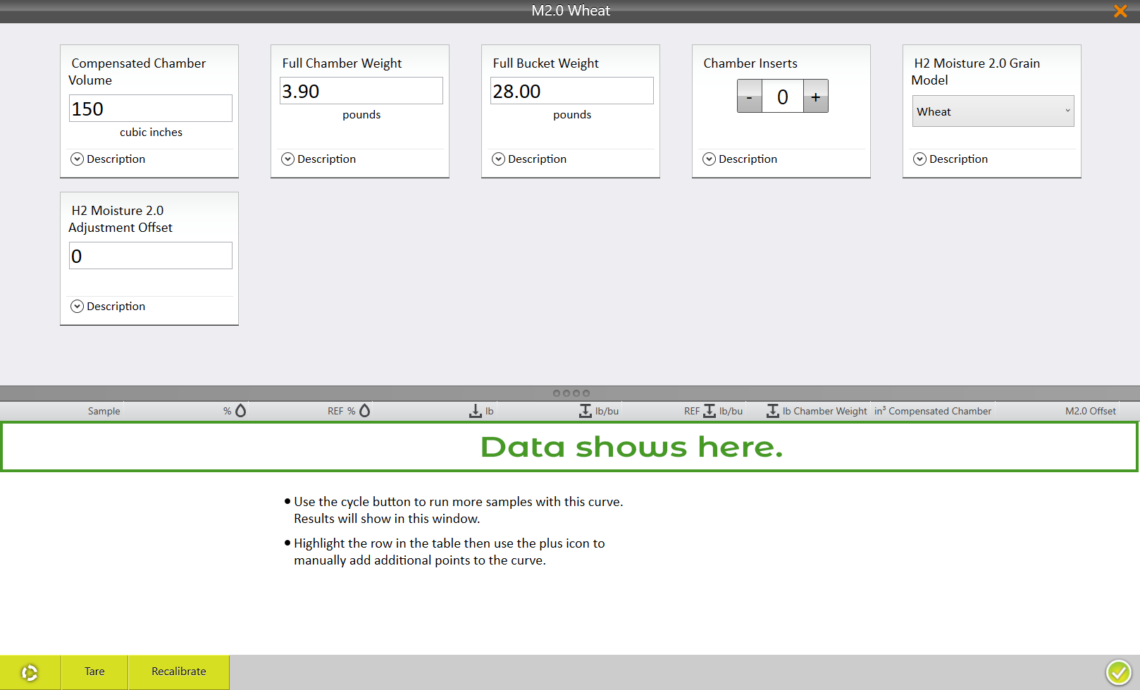 The chamber calibration will create an M2.0 Calibration File (moisture curve) that stores the type of crop being harvested, the calibrated chamber volume, the number of inserts, the offsets to the default M2.0 moisture prediction, and other pertinent data. When creating an M2.0 Calibration File, Mirus will automatically generate an EM Moisture Curve within the same file. Although you will only see the M2.0 predictions during harvest, both moisture methods (M2.0 & EM) are calculated and available for export.