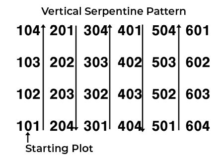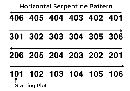 - Serpentine pattern numbers the plots in a back and forth pattern across the field. The back and forth pattern can be either horizontal or vertical.