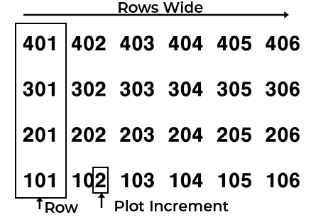 Plot numbering begins in the bottom left corner of a field and proceeds right.