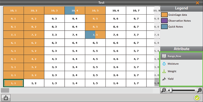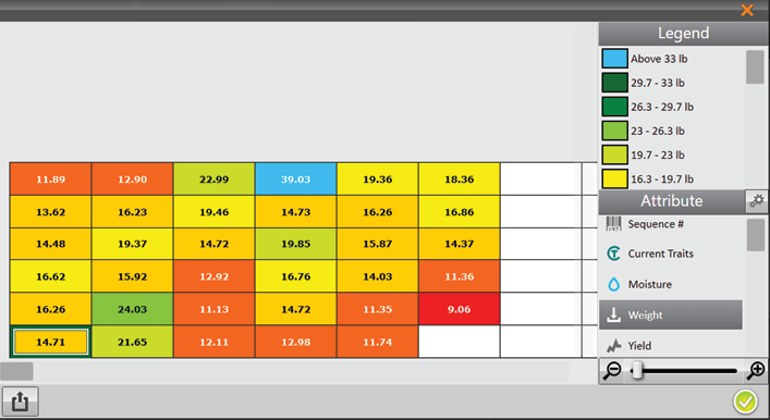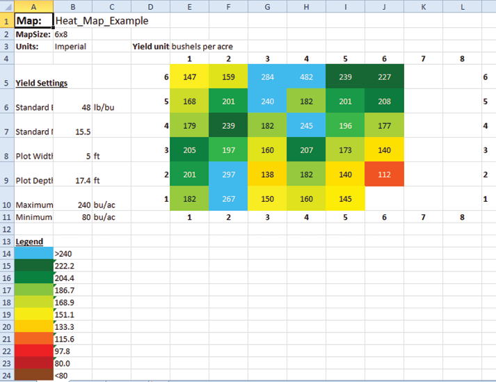 Exporting a heat map creates a color-coded visual map in a spreadsheet for each desired attribute. The colors in the heat map are determined by the Legend. It can be altered by changing the minimum and maximum for each attribute. For instructions, see the following sections: Configure Weight in Spatial Display, Configure Moisture in Spatial Display, Configure Test Weight in Spatial Display, and Configure Plot Size and Yield in Spatial Display.