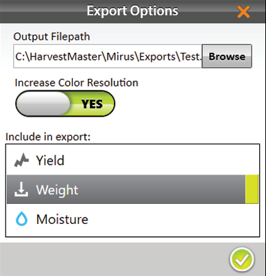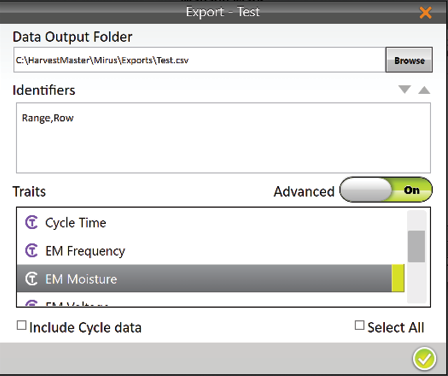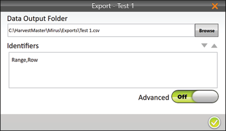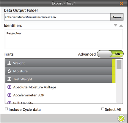 When Advanced is switched to Off, Mirus automatically exports the data for weight, test weight, and moisture.