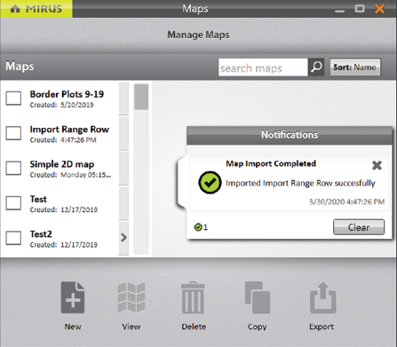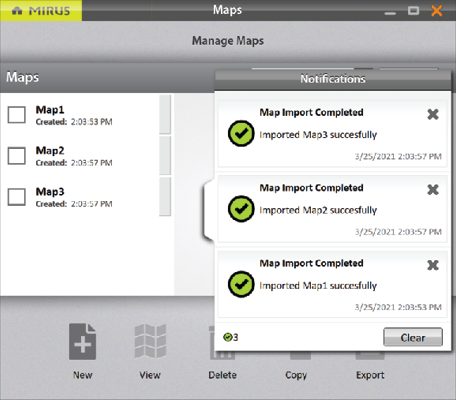 On the Manage Maps screen, Mirus displays a notification that the maps have been imported successfully.