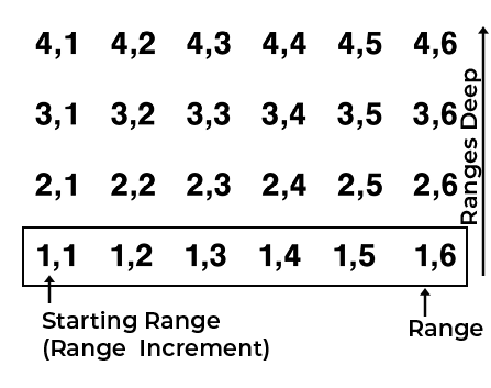 Range numbering begins with the bottom left corner of a field and proceeds upward.