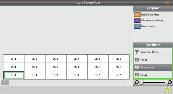 In Mirus you can easily import maps created in Microsoft Excel or research programs such as PRISM® and AGROBASE®. This can be done in Range Row and Two Dimensional (2D) formats. The imported field map may include information such as Range, Row, Replication, Pass, Pedigree, or other plot identifiers. You can view these identifiers when you open the map in Harvest Mode. (For more information, refer to Graph View and List View.)