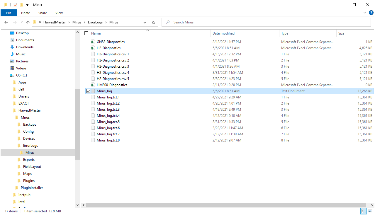 2. Go to C:\HarvestMaster\Mirus\Errorlogs\Mirus and C:\HarvestMaster\Mirus\Backups.
