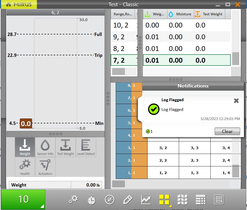 5. Put the HarvestMaster calibration weight in the bucket with the top gate closed and check it against the calibration weight in Diagnostics.