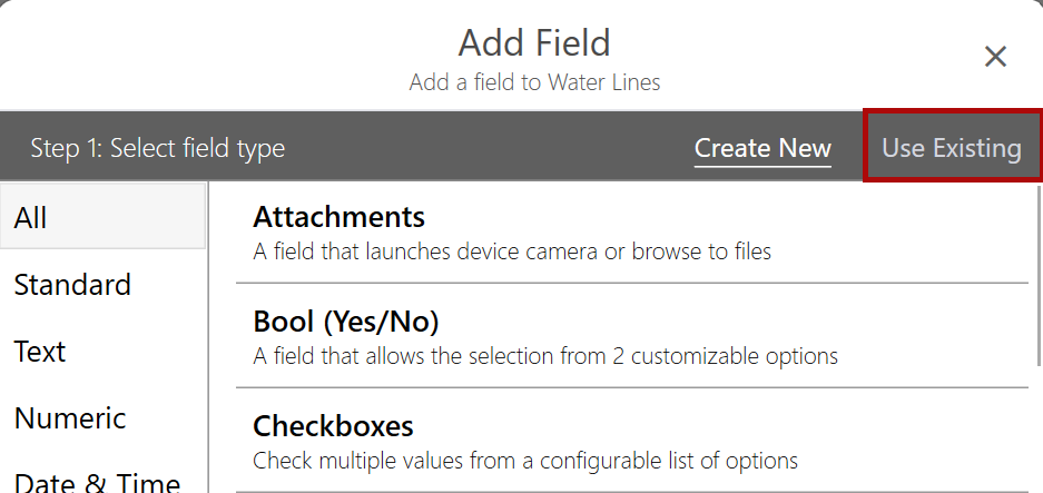 Creating a new field is the default. To use a field defined in other records, tap Use Existing.