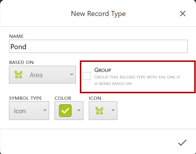 - Select Group to organize the new record type with its base record type. For information on the benefits of grouping records, see Group Record Types.