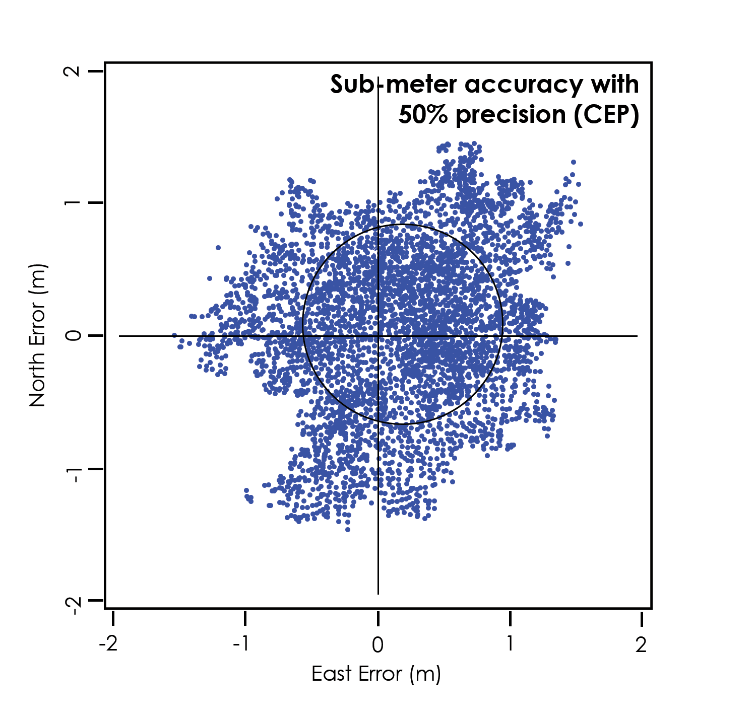 For the Geode in ideal conditions, 95–98% of the points on a scatter plot will fall within a sub-meter radius of the true point.