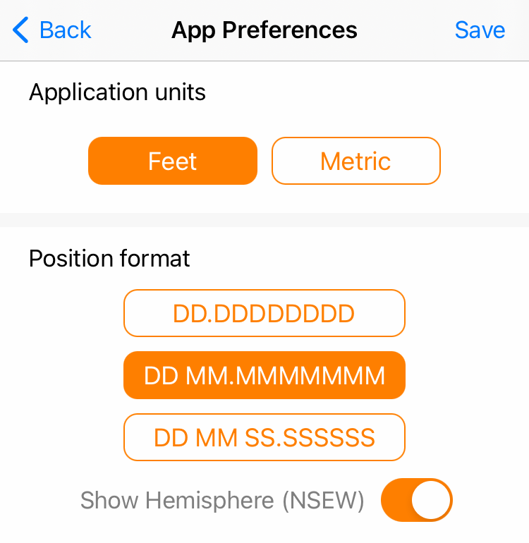 You can specify application units (feet or metric), position format, and whether the app will show the hemisphere.