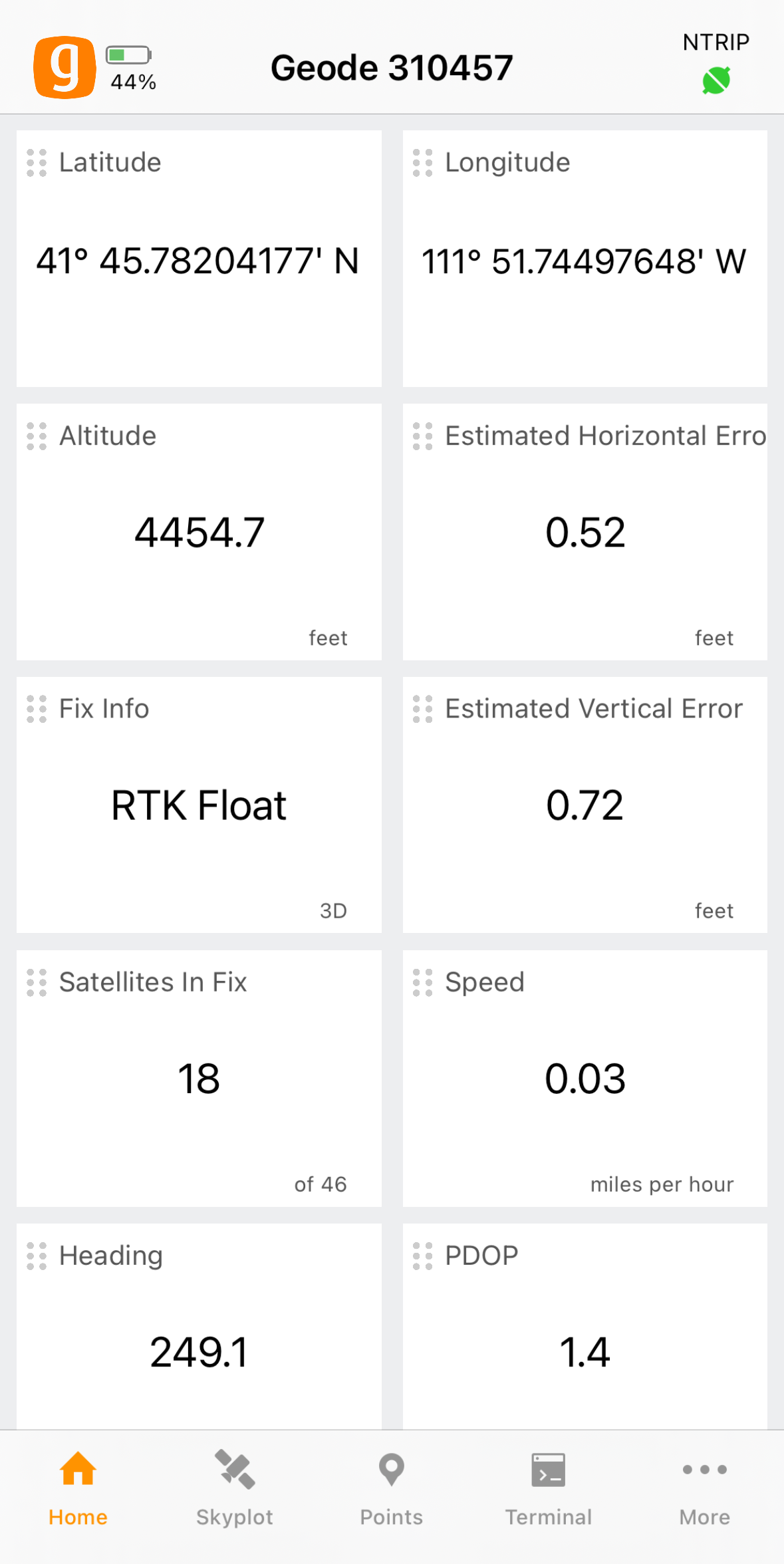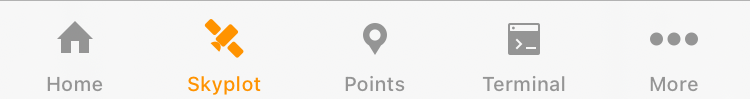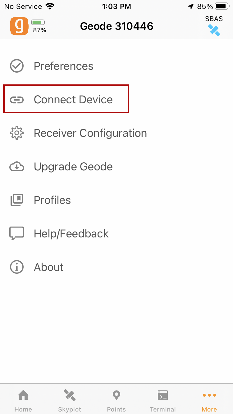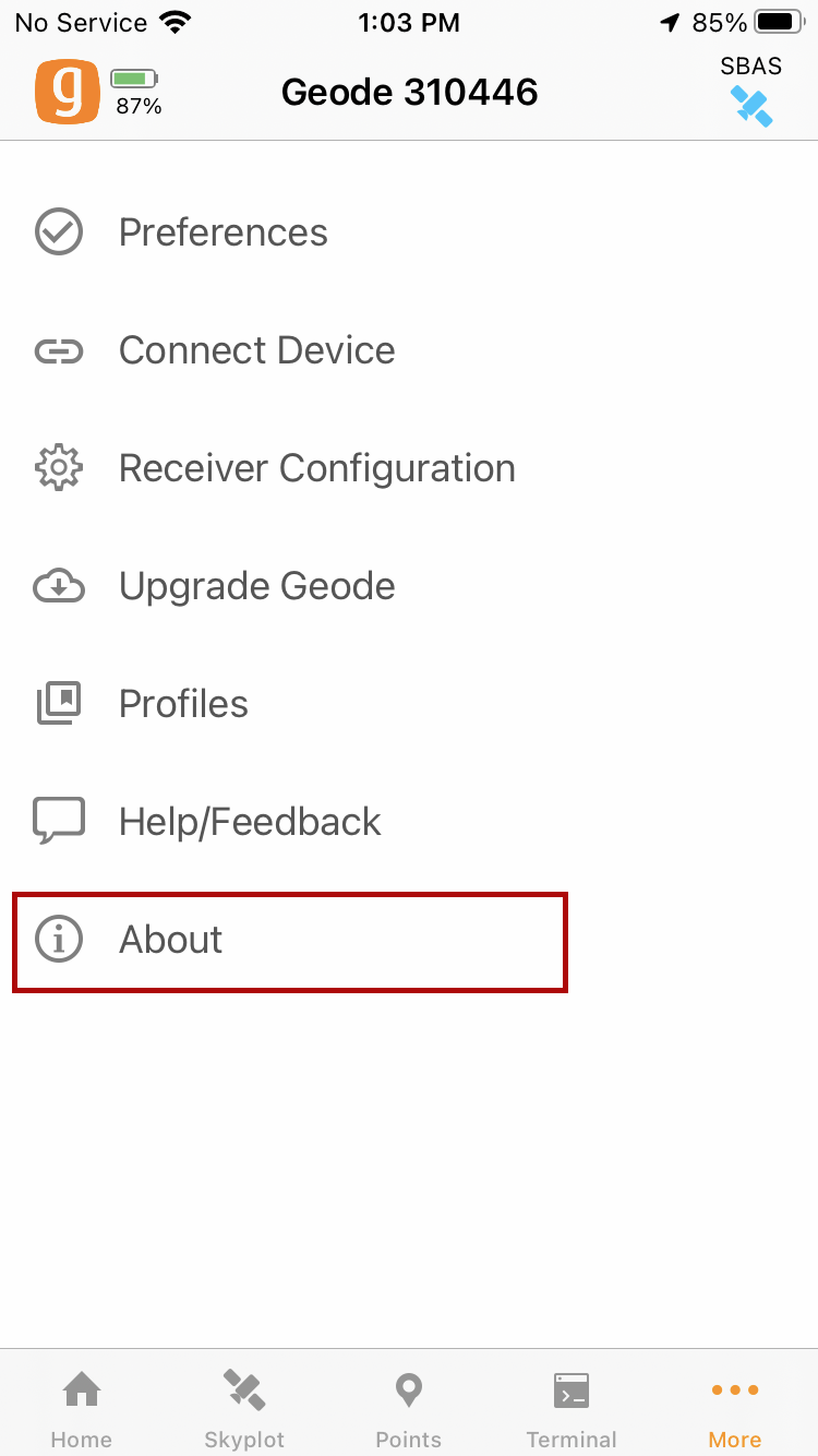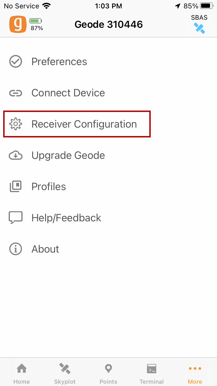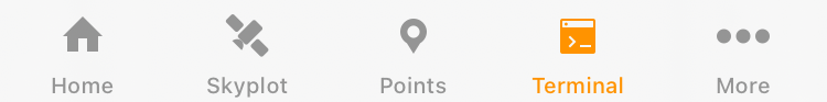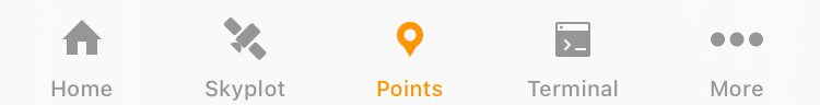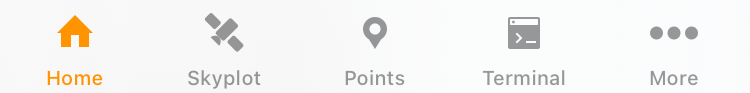 From the toolbar on the bottom of the screen, you can access the Skyplot, Points, Terminal, and Settings screens. Tap More in the bottom right corner to configure the connected receiver. Tap the orange Geode icon in the top left corner to disconnect or change your receiver. The satellite icon in the top right corner tells you which correction service you are using, and it turns green when you are connected. If the RD1 NMEA sentence is enabled, the satellite icon color changes relative to the signal quality. For more information, see Atlas Correction Service.