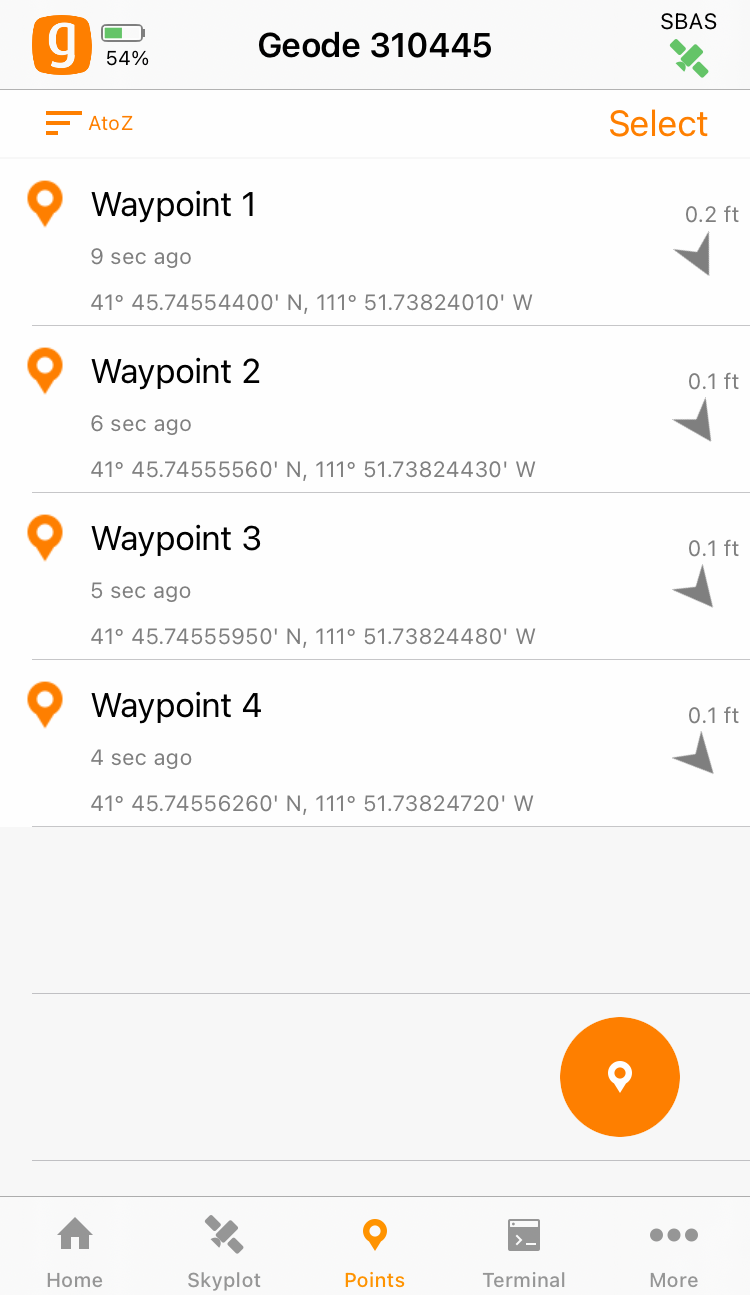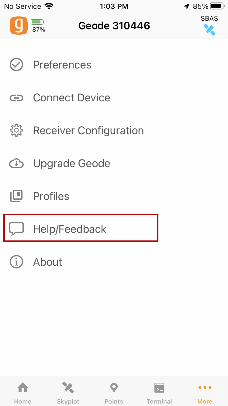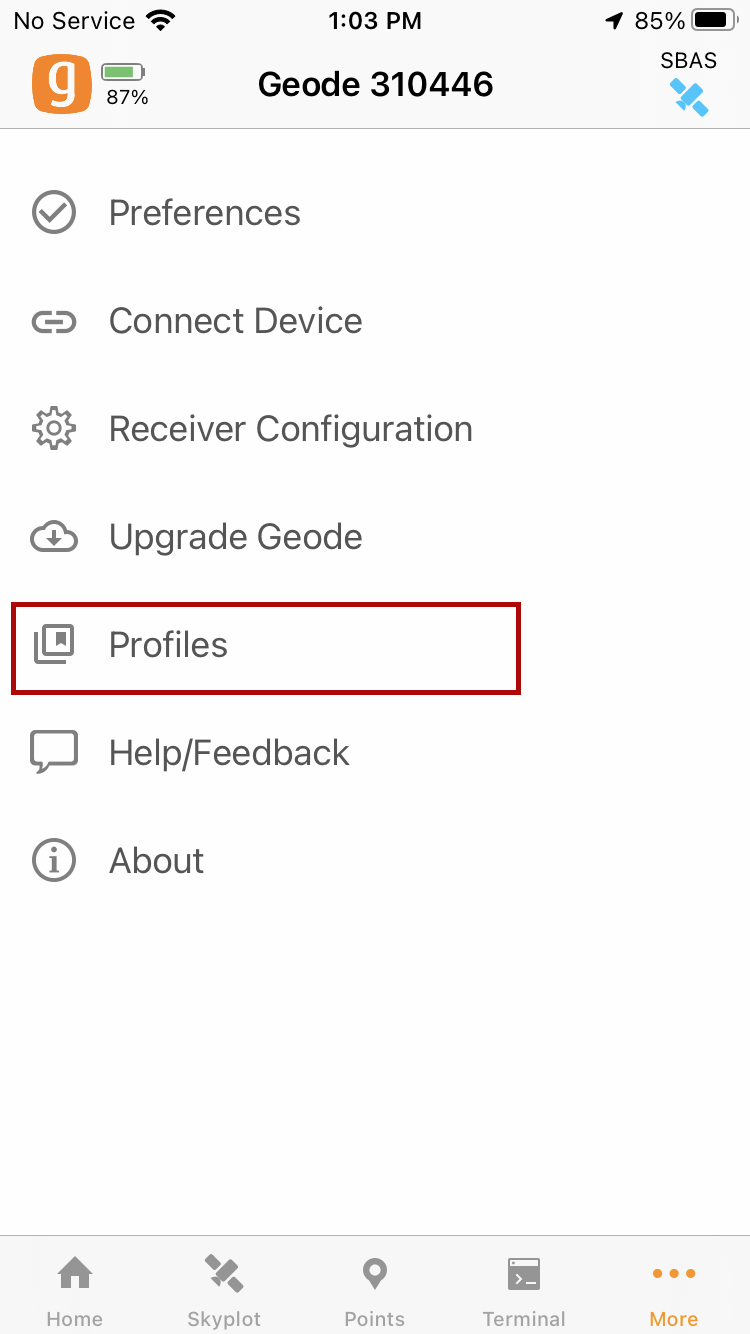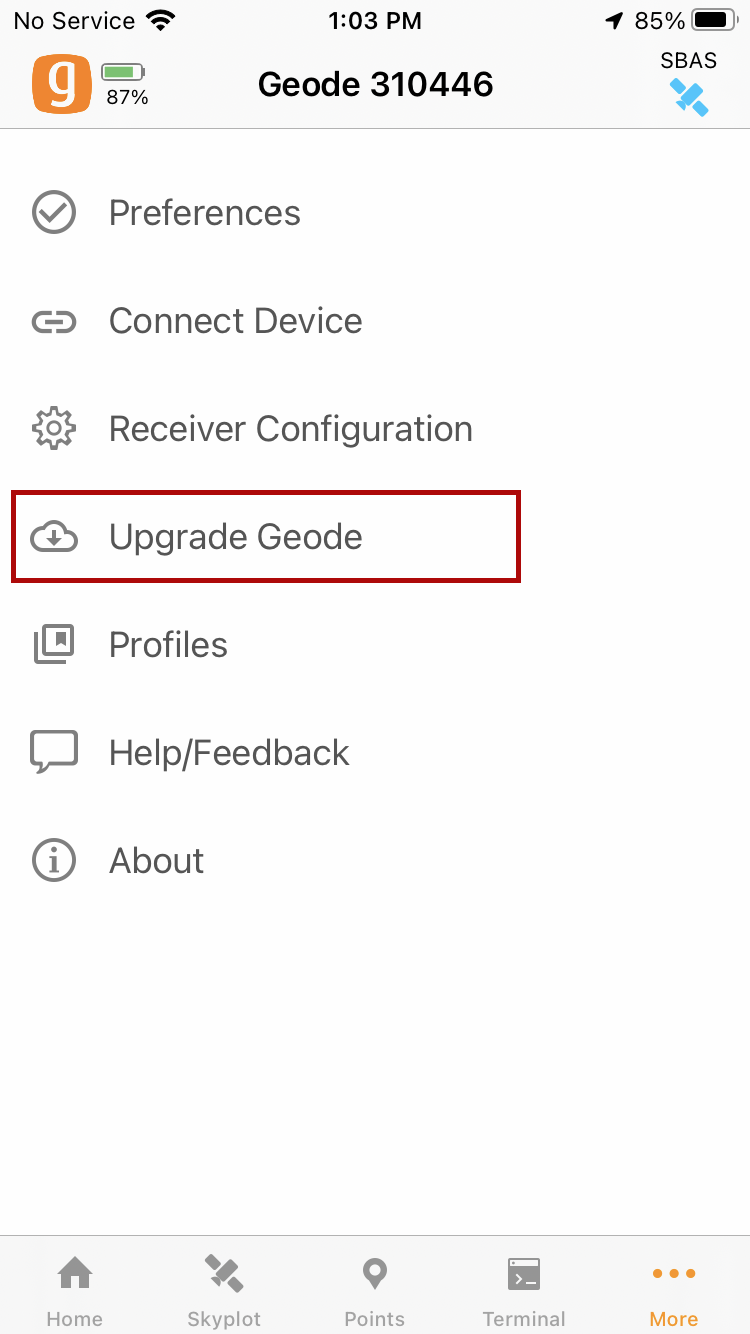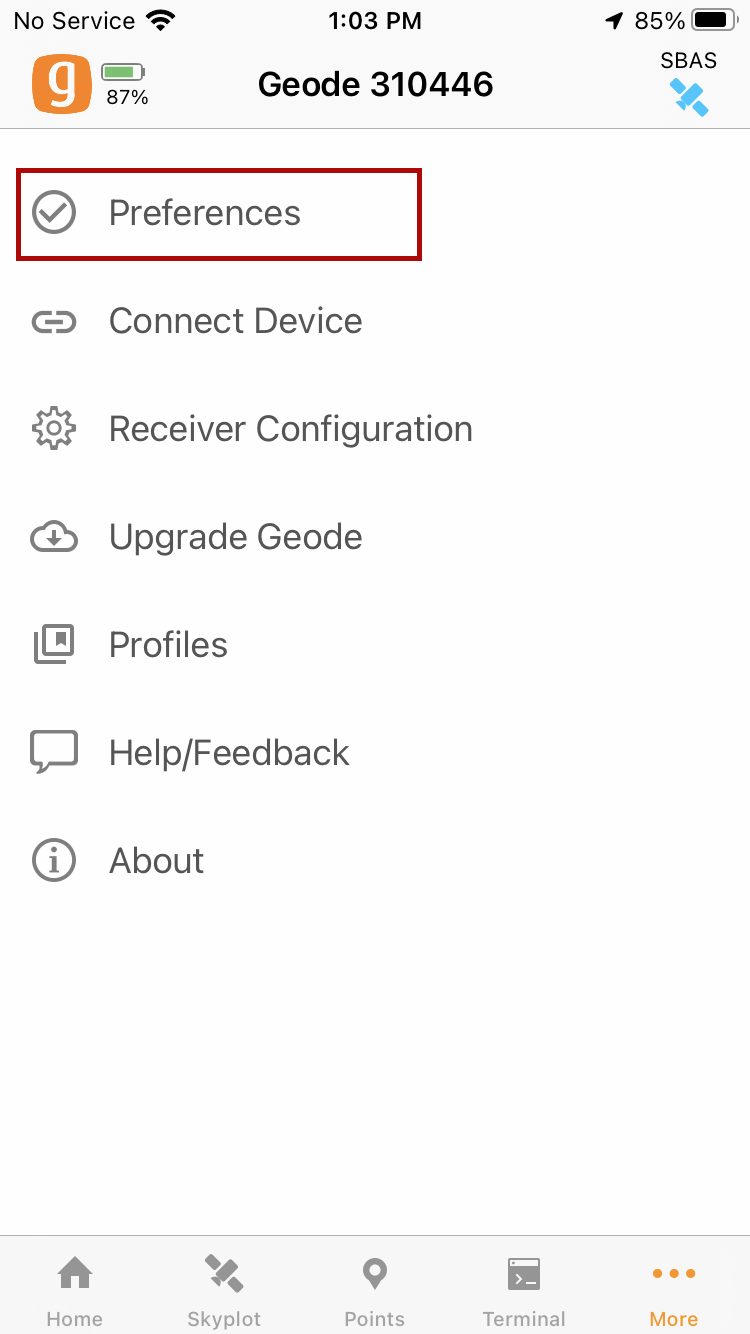 From the toolbar on the bottom of the screen, you can access the Skyplot, Points, Terminal, and Settings screens. Tap More in the bottom right corner to configure the connected receiver. Tap the orange Geode icon in the top left corner to disconnect or change your receiver. The satellite icon in the top right corner tells you which correction service you are using, and it turns green when you are connected. If the RD1 NMEA sentence is enabled, the satellite icon color changes relative to the signal quality. For more information, see Atlas Correction Service.