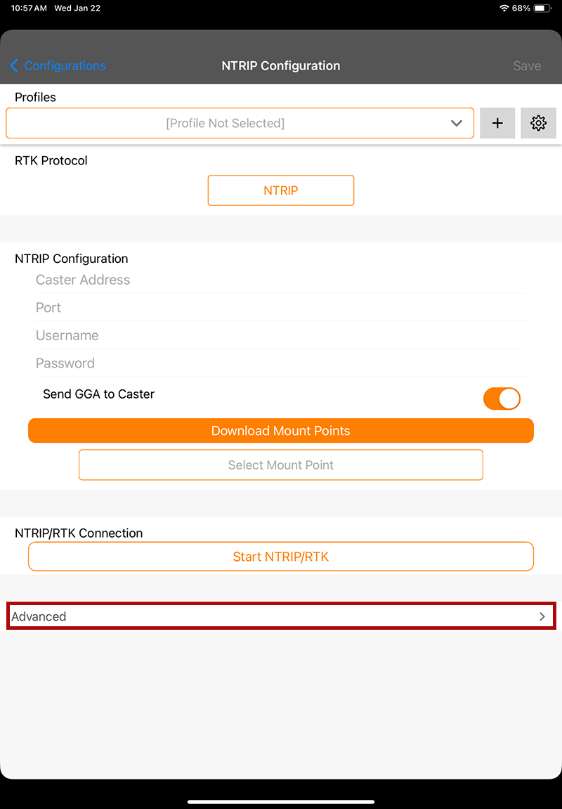 Use TLS/SSL. From NTRIP/RTK Configurations Advanced screen you can indicate that you would like to use a TLS/SSL connection to your NTRIP service provider. Your NTRIP service provider will let you know if you need to use this option.