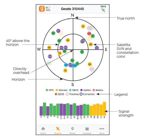 On the Skyplot screen, each satellite is identified by a space vehicle number (SVN) and color for its constellation. The location of each satellite on the Skyplot indicates where its location in the sky relative to true north. The outside ring is 0° elevation (horizon). The inside ring is 45° elevation—halfway above the horizon from the Geode’s present location. The intersection of the two lines indicates directly overhead.