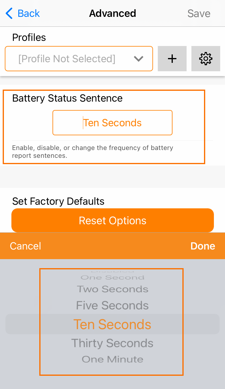 This gives the option to choose how frequently the Geode sends a battery status message. The message is used by Geode Connect and other applications to display the battery capacity status. The default setting is 10 seconds.