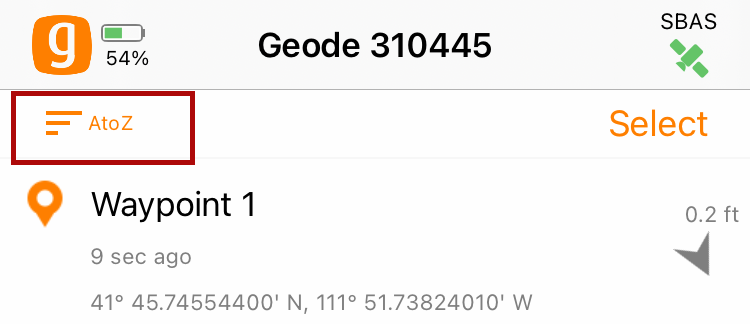 Organize waypoints by tapping in the upper left corner beneath the Geode symbol. The app will cycle through the following organizational methods: oldest, newest, A to Z, Z to A, and proximity.