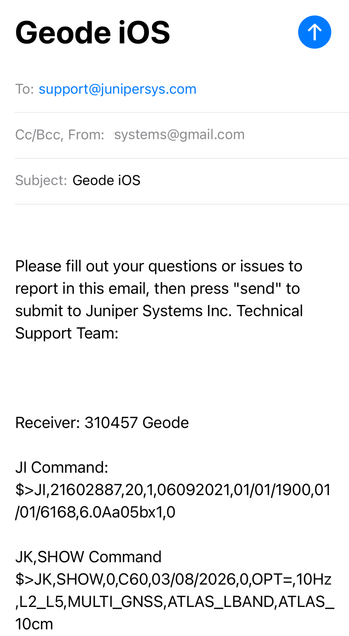 This feature links directly with the email account configured on your device and opens an email addressed to Juniper Systems Support. The email includes detailed configuration commands from the Geode. This allows Juniper Systems Support to diagnose and solve the problem more efficiently. This info is also used when purchasing a feature upgrade for the Geode.