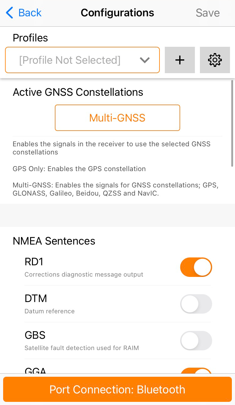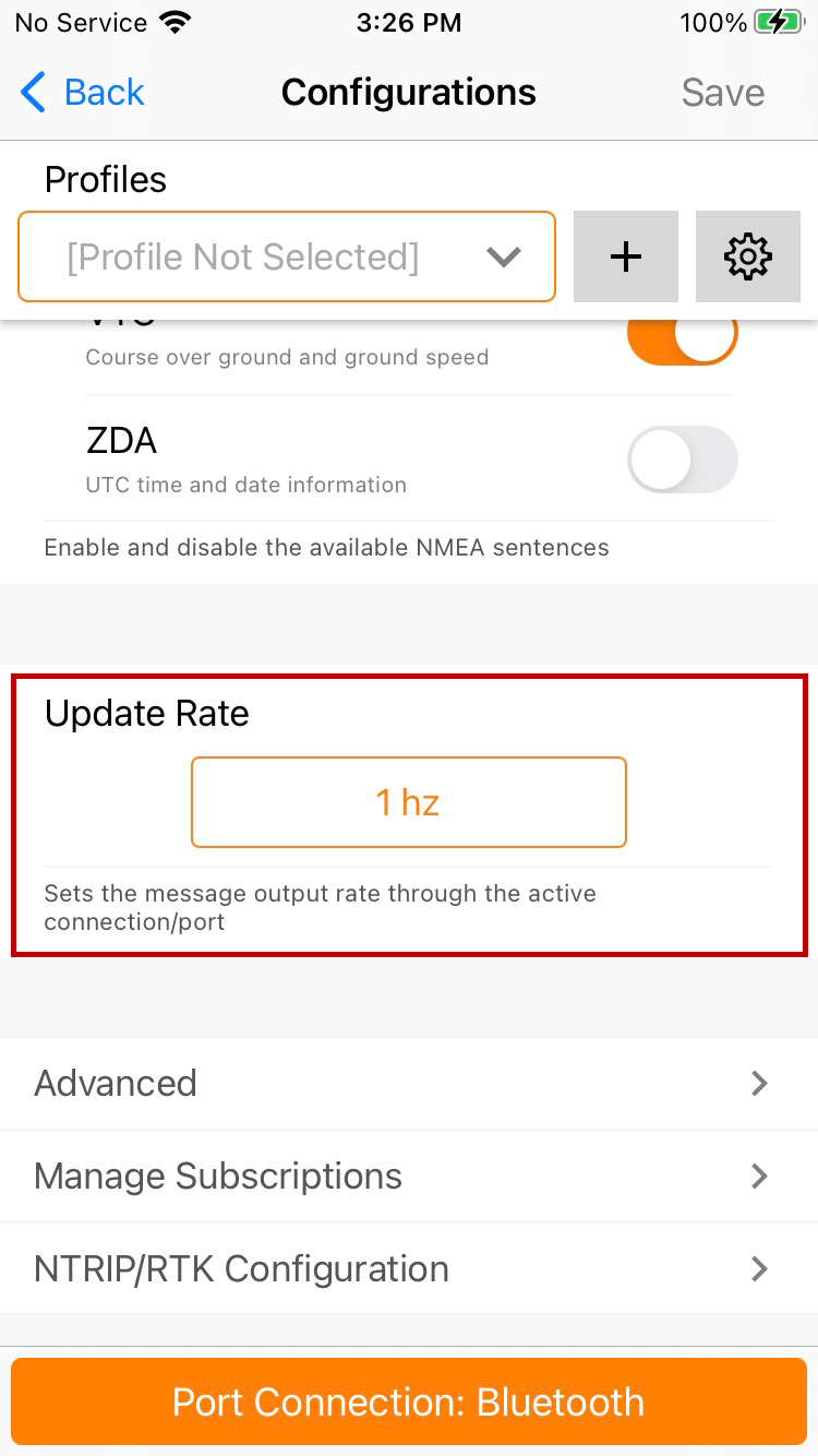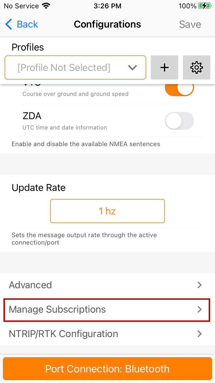 - Select the appropriate settings for active GNSS constellations, NMEA sentences, and update rate. Expand an area to view additional advanced settings, to manage subscriptions, and to configure NTRIP/RTK.