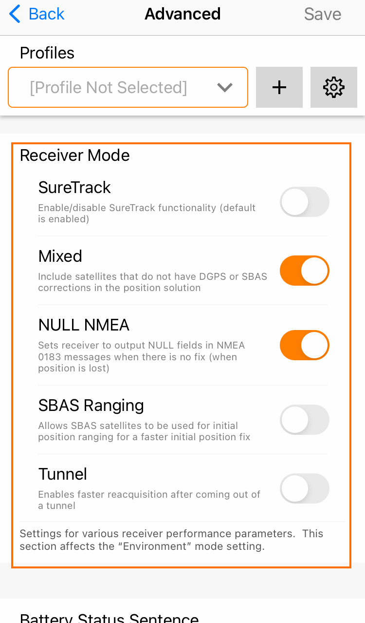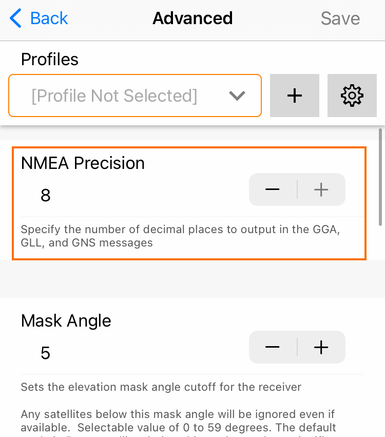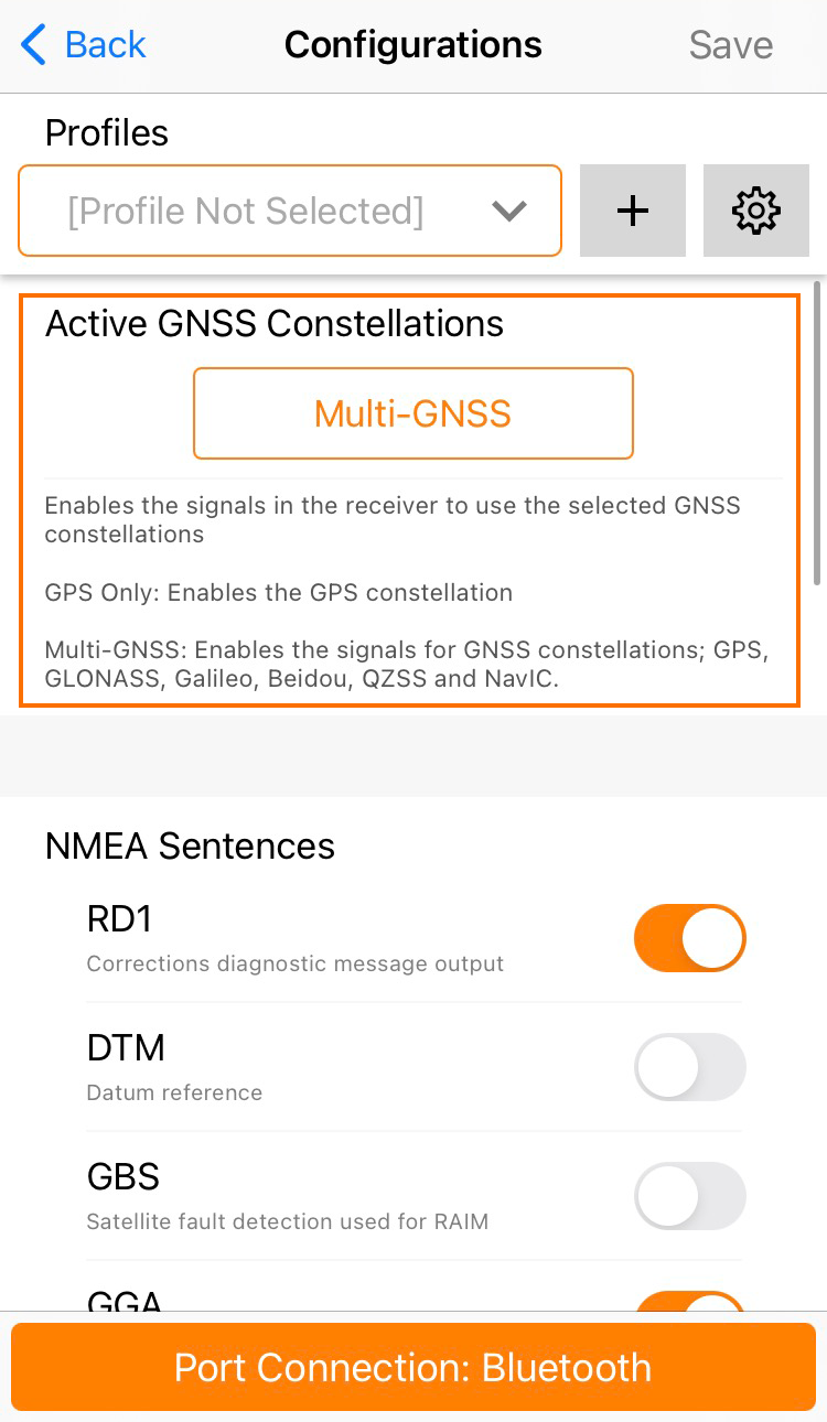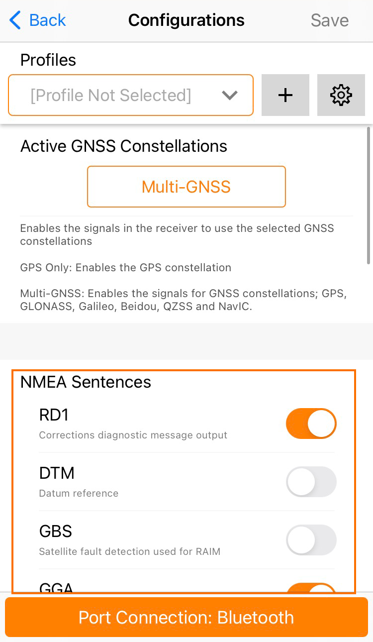 - Select the appropriate settings for active GNSS constellations, NMEA sentences, and update rate. Expand an area to view additional advanced settings, to manage subscriptions, and to configure NTRIP/RTK.
