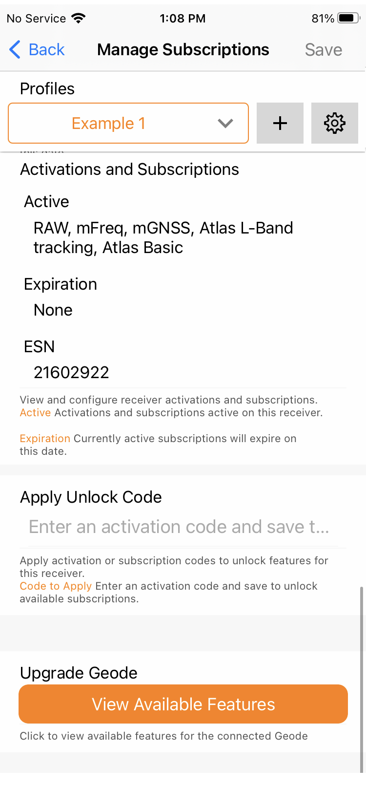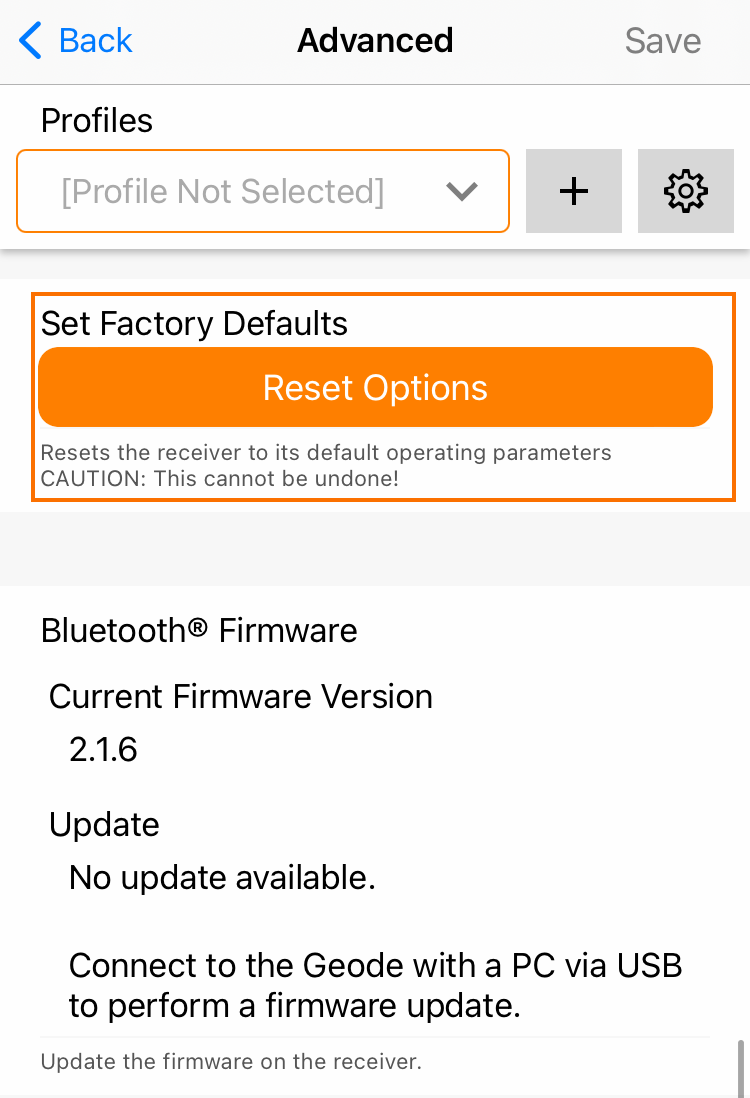 Note: The Receiver Configuration options are only available if you are actively connected to a Geode receiver. Changes saved on these screens are changes made to the Geode receiver, and these changes apply to all navigation and data collection apps using the Geode receiver.