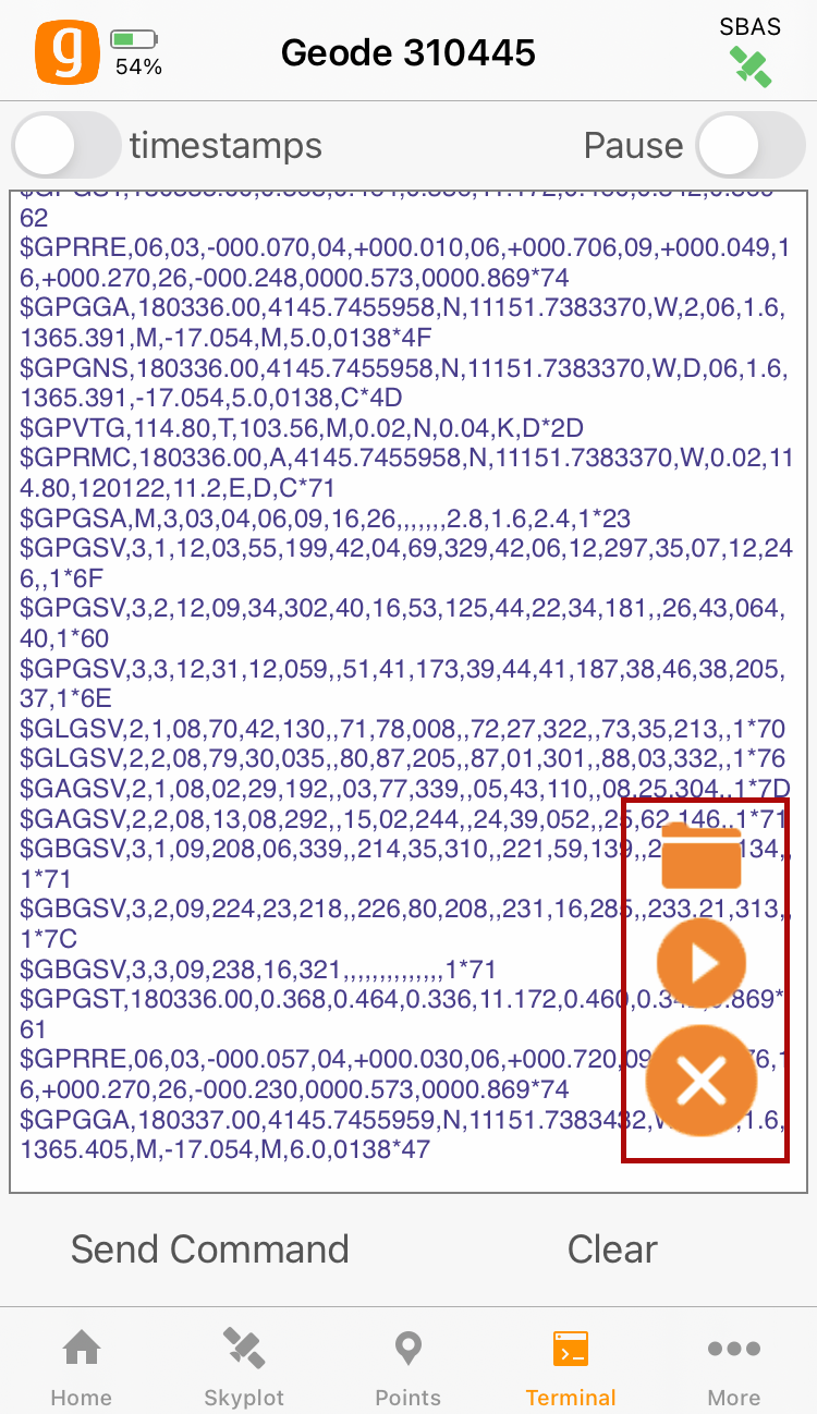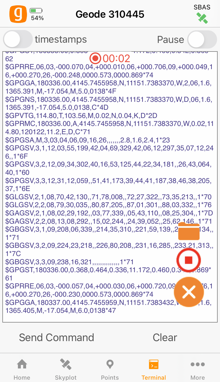 The Terminal screen displays the NMEA sentences the Geode is receiving. It provides the options to include time stamps (top left) or to pause the data (top right).