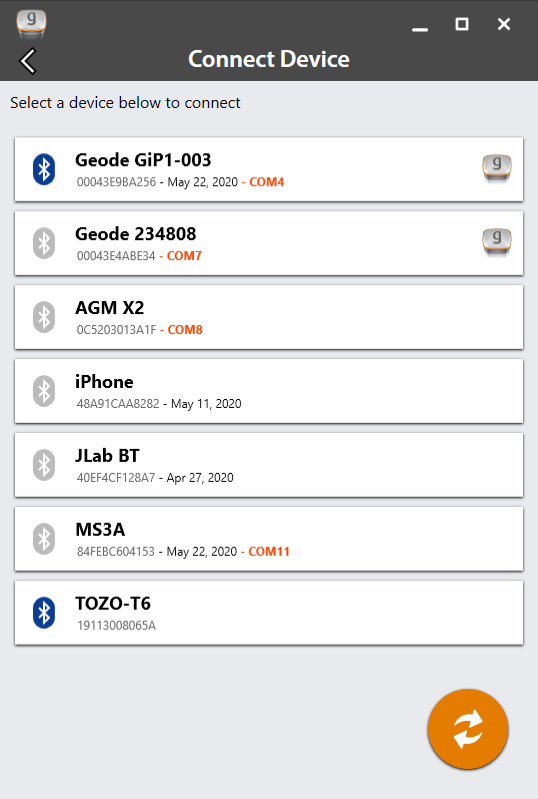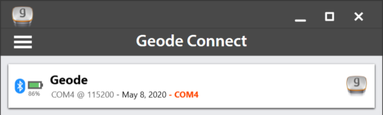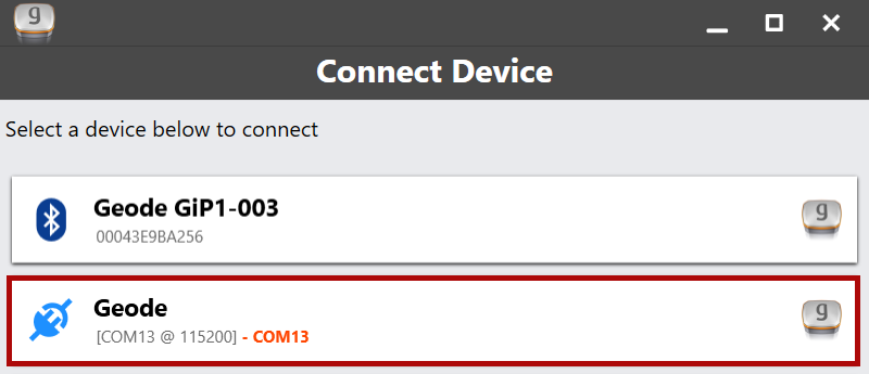 - The app will display a list of local wireless and connected devices. It may list the same Geode twice, once as a Bluetooth wireless device and once as a physically connected device. The Geode connected via serial cable will have a plug icon next to it. Select this Geode.