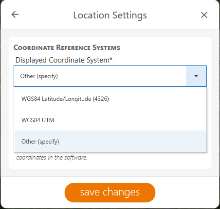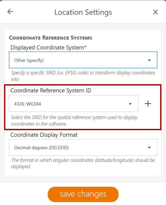 | Coordinate Display Format | Decimal degrees (DD.DDD) | When the displayed coordinate system includes a variety of display options, this field appears. If there are no options available in the chosen coordinate system, this field is hidden. |