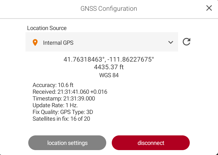 Uinta displays information about the receiver, including the accuracy, location, and fix quality.
