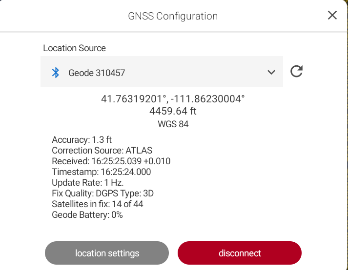 | Correction Source | Auto | N/A | For more information, see Geode is not Seeing Satellites. |