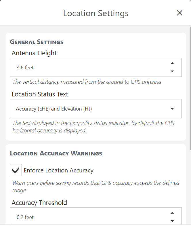 Enable Enforce location accuracy to have Uinta warn you if the GPS accuracy exceeds the defined accuracy threshold. After the warning appears, you can choose whether to save the location that exceeds the accuracy threshold. |