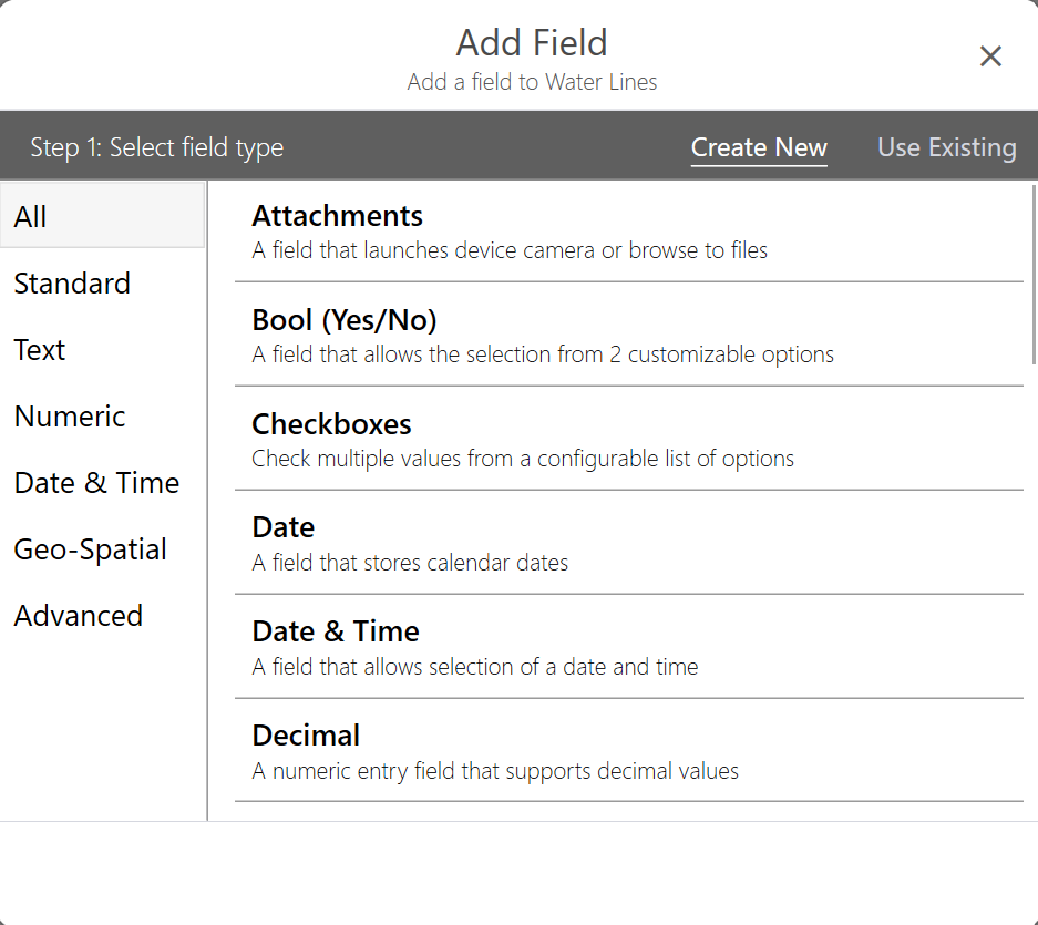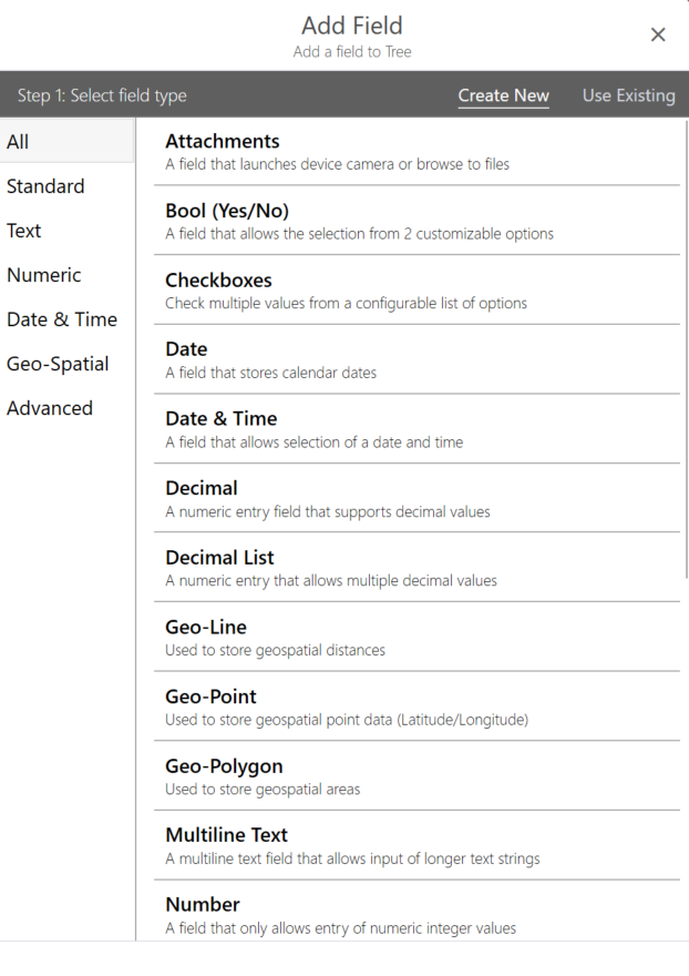 Creating a new field is the default. To use a field defined in other records, tap Use Existing.