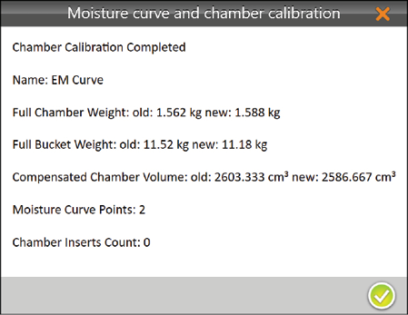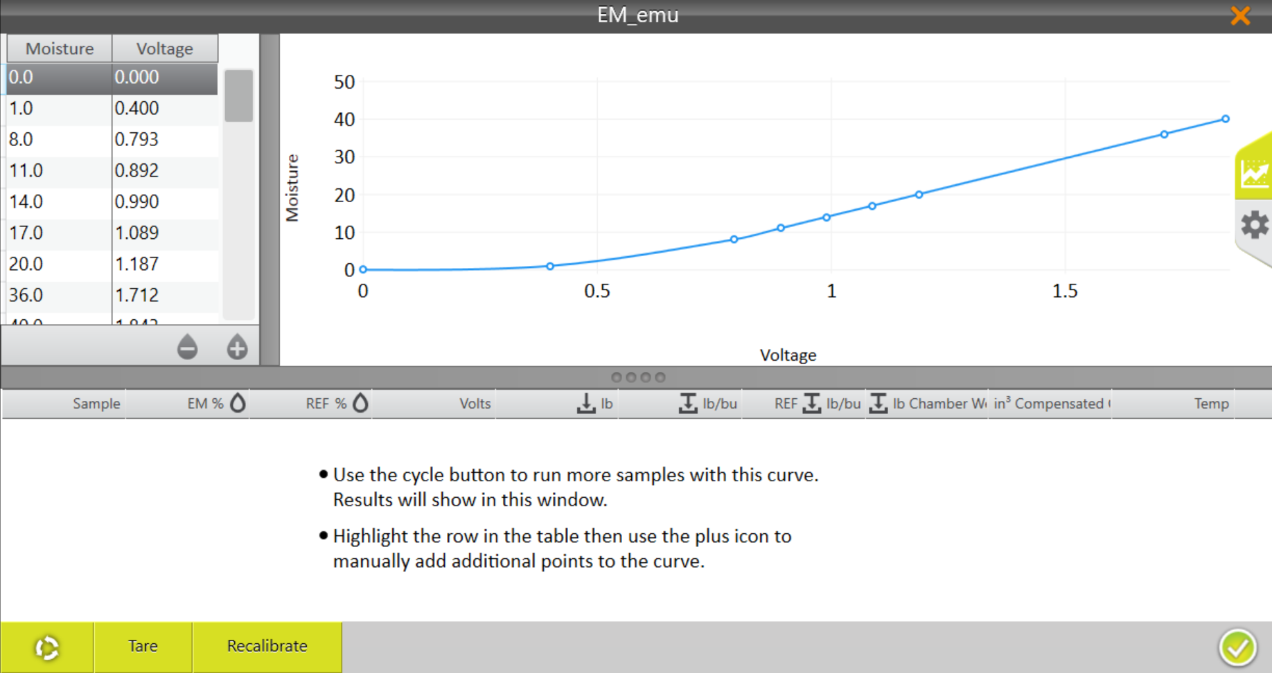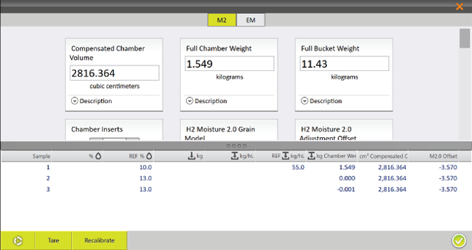 The chamber calibration will create an EM Calibration File (moisture curve) that stores the calibrated chamber volume, the number of inserts, a relationship between the output of the EM Sensor and a moisture prediction (a curve), and other pertinent data. If the desired crop is available via M2.0, HarvestMaster recommends creating an M2.0 Calibration File and not an EM Calibration File.