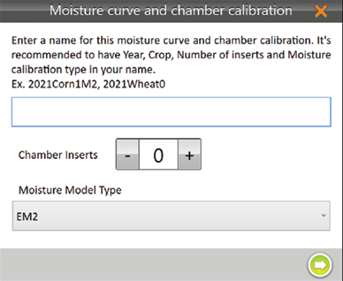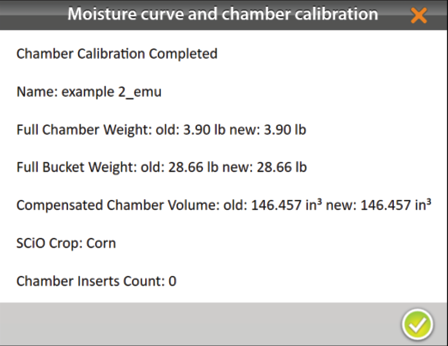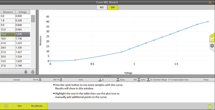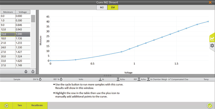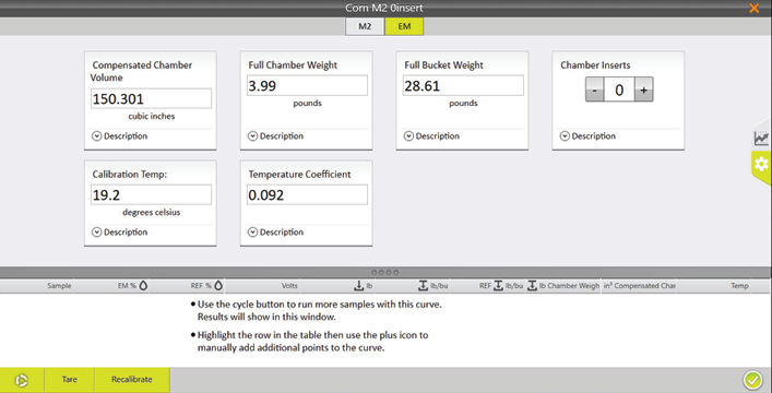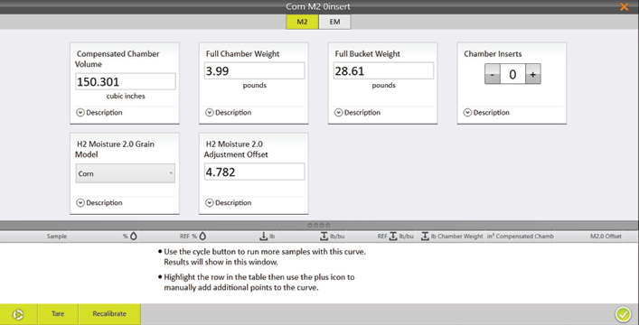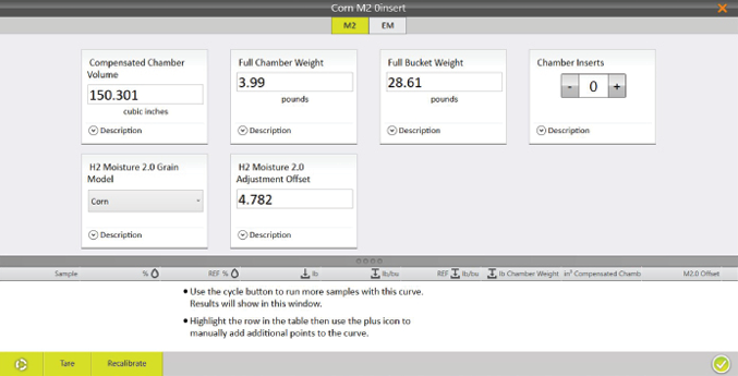 The chamber calibration will create an M2.0 Calibration File (moisture curve) that stores the type of crop being harvested, the calibrated chamber volume, the number of inserts, the offsets to the default M2.0 moisture prediction, and other pertinent data. When creating an M2.0 Calibration File, Mirus will automatically generate an EM Moisture Curve within the same file. Although you will only see the M2.0 predictions during harvest, both moisture methods (M2.0 & EM) are calculated and available for export.