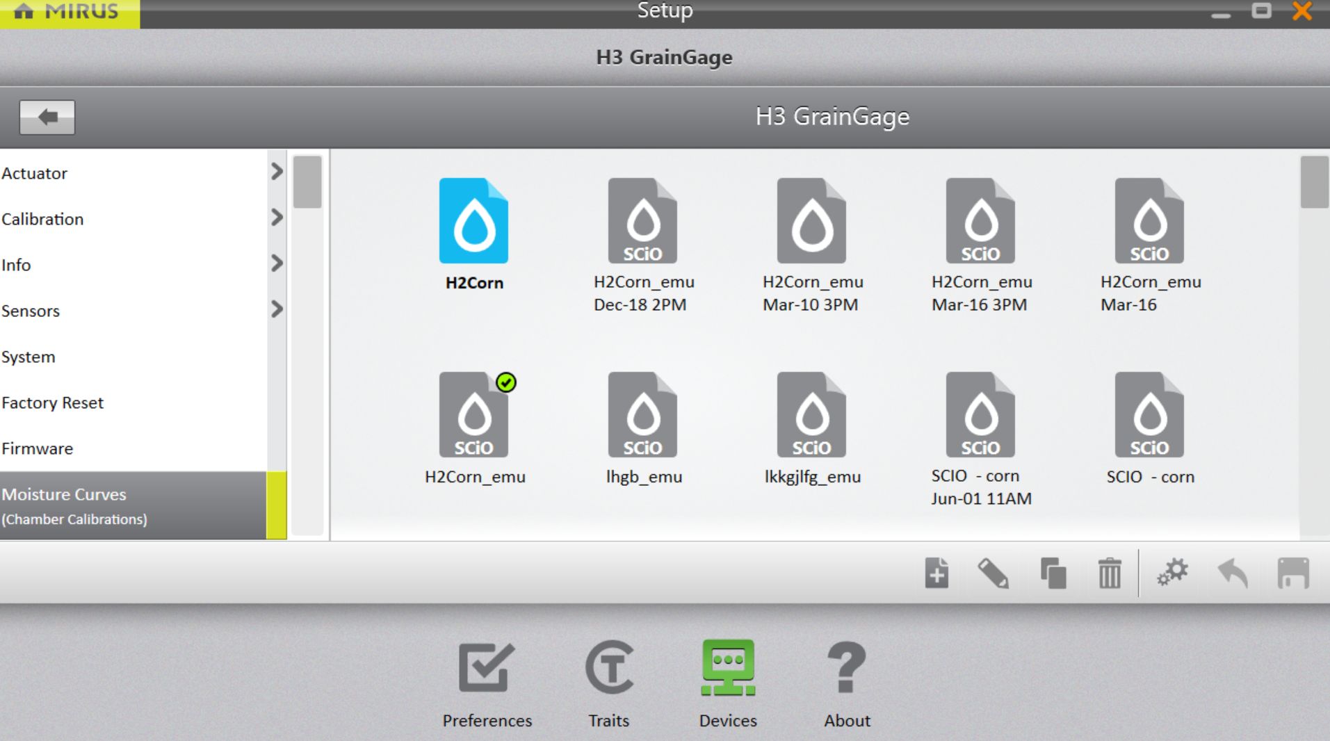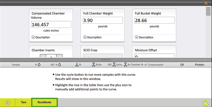 The chamber calibration will create a SCiO Calibration File (moisture curve) that stores the type of crop being harvested, the calibrated chamber volume, the number of inserts, the offsets to the default SCiO data predictions, and other pertinent data. While Mirus allows you to offset SCiO data using the Recalibrate feature within the calibration file, HarvestMaster advises against offsetting. We recommend creating a calibration file specifically for your harvest conditions as described in Create a SCiO Calibration File.