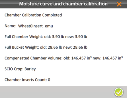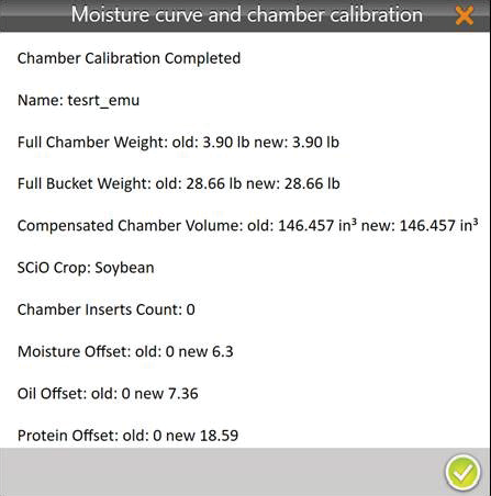 The GrainGage cycles the grain, and Mirus displays details of the calibration. - Tap the check icon