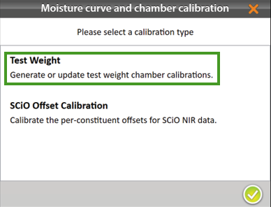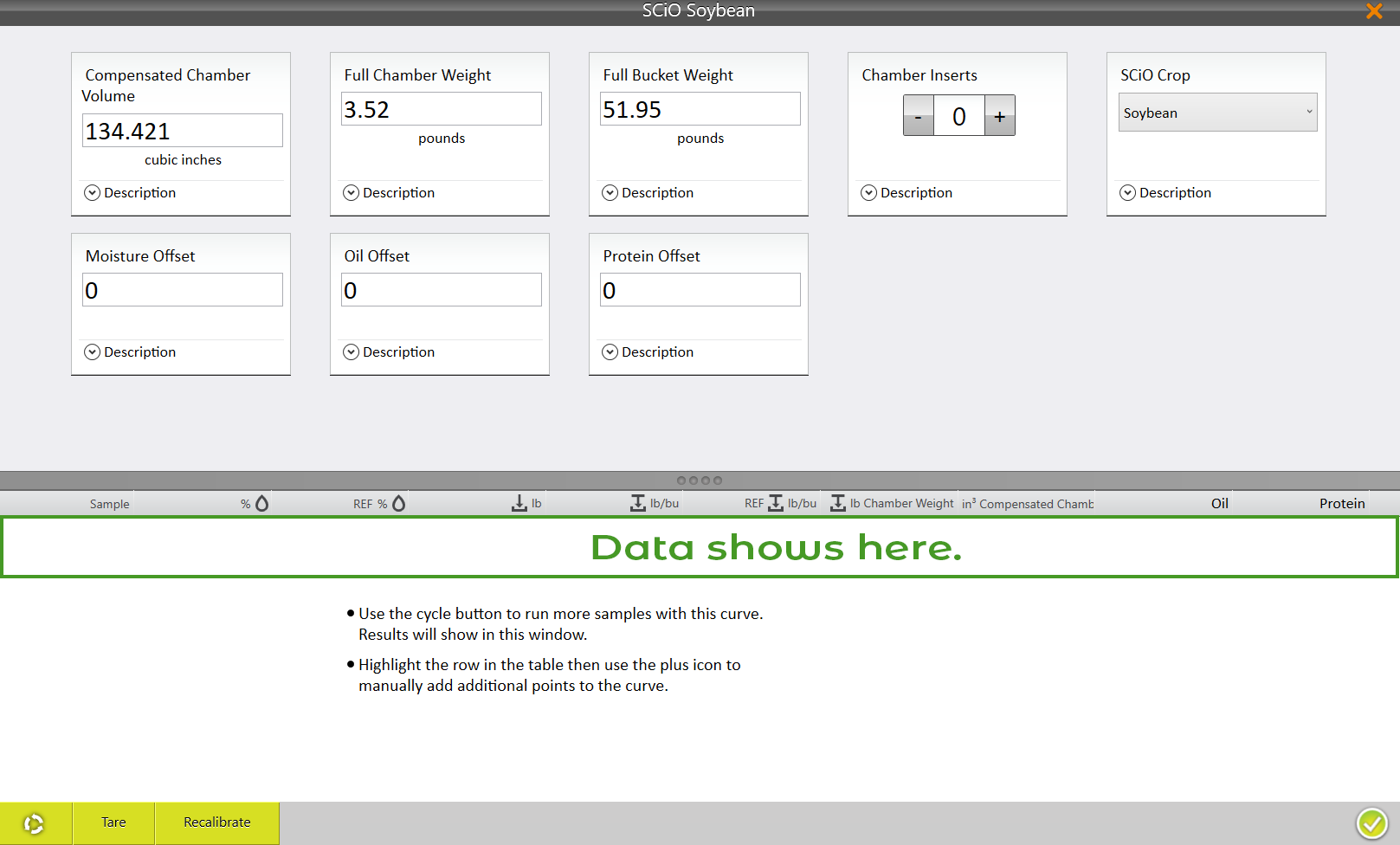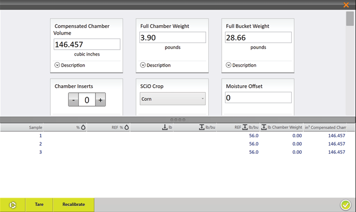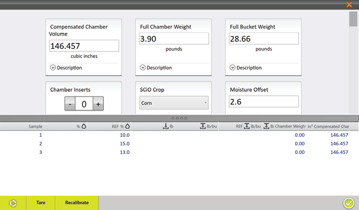 The purpose of the following calibration is to select a crop and calibrate the test chamber volume (test weight). The default SCiO moisture/protein/oil (where applicable) value in Mirus is compiled from thousands of samples around the world. While it is possible for you to offset that data and make it more relevant, HarvestMaster does not recommend doing so. (If you would like to offset the SCiO moisture/protein/oil (where applicable see SCiO Offset Recalibration.)