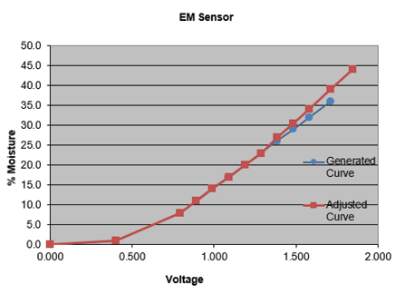 When calibrating with high moisture corn samples, some moisture curves do not follow a linear voltage relationship. HarvestMaster recommends manually adjusting the upper half of moisture curves with grain samples above 26%.