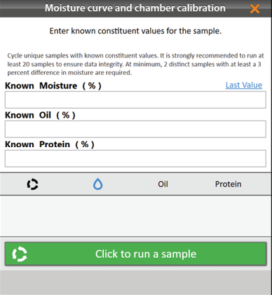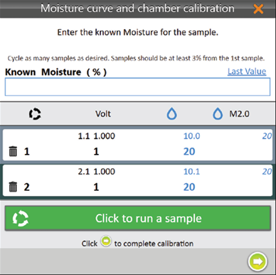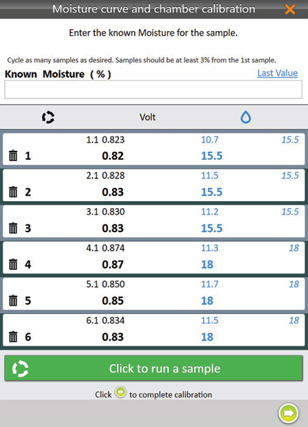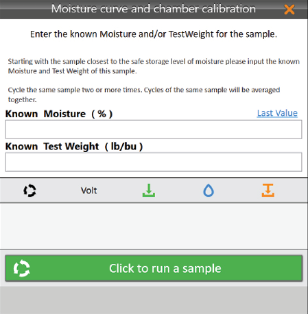 Continue the calibration with a dry grain sample and a wet grain sample (more samples can be used as well). Each sample should be cycled at least three times.