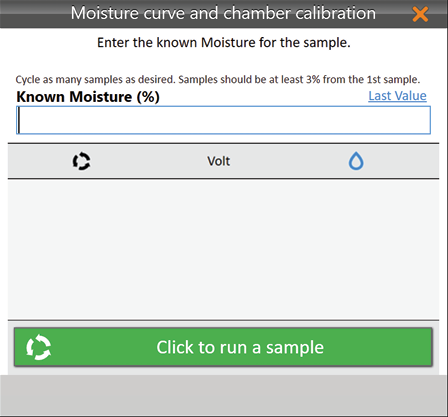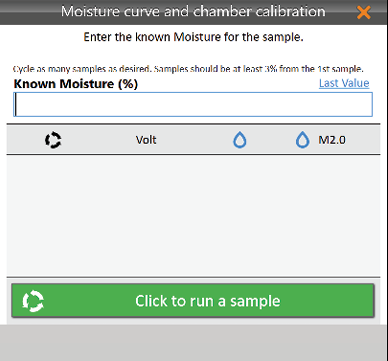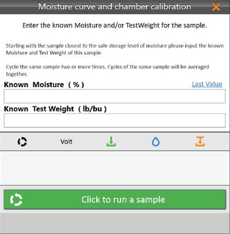 HarvestMaster recommends using multiple samples when possible.The Last Value button can be used to fill the Known Moisture field with the previous percentage when the same sample is run multiple times.