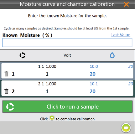The Last Value button can be used to fill the Known Moisture field with the previous percentage when the same sample is run multiple times. - Tap the next arrow