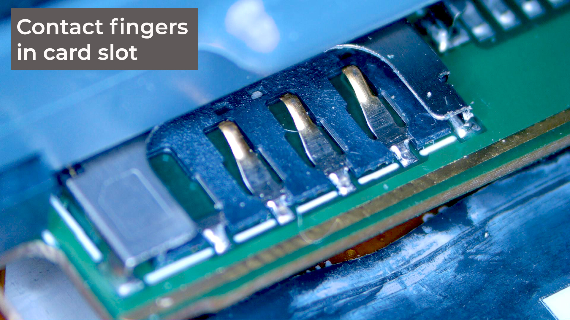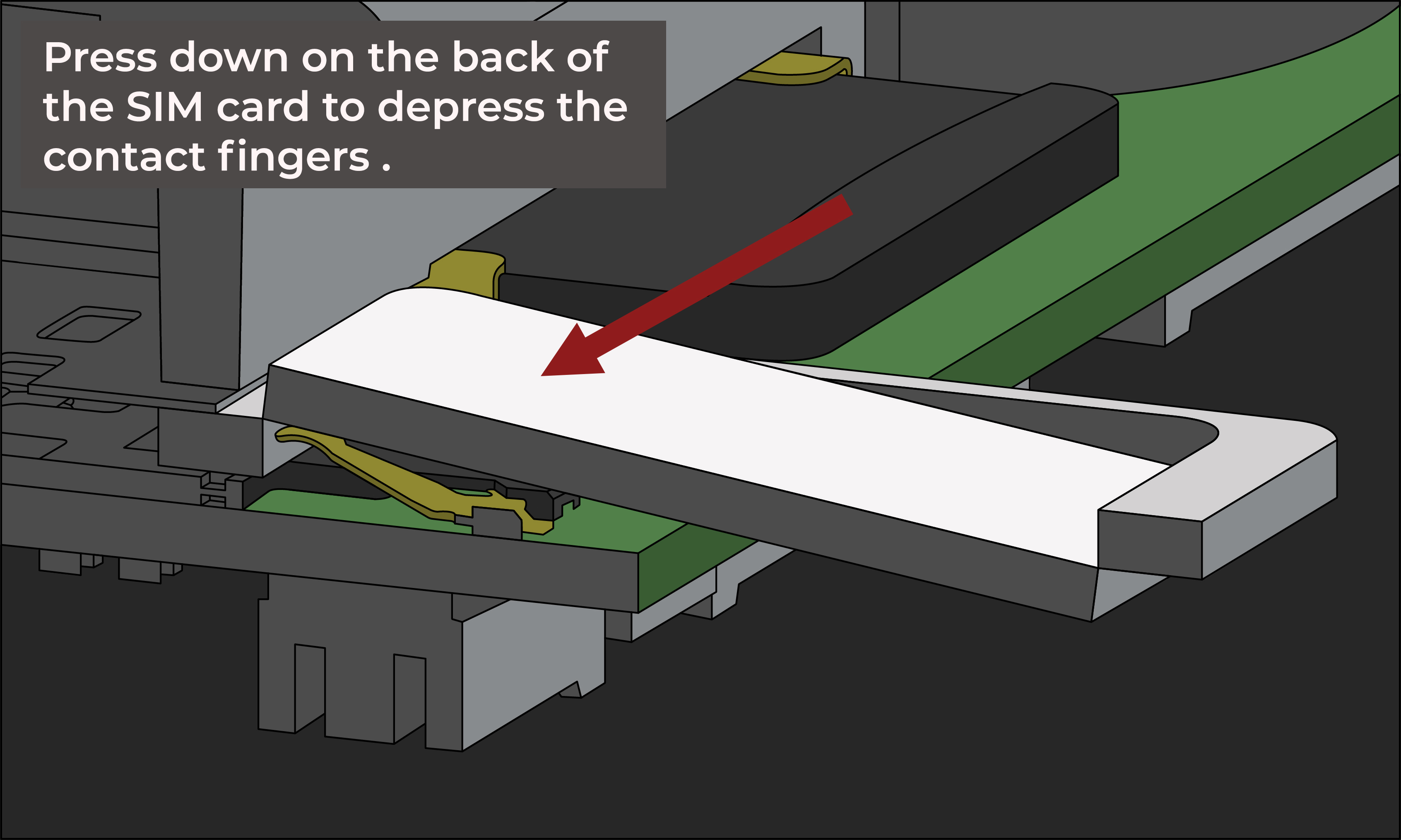 CAUTION: The first contact finger is intentionally missing. The other three contact fingers are required for the Mesa tablet to read the SIM card. Forcefully pulling on the SIM card or tray adapter can break the contact fingers, causing permanent damage. For repairs, contact a certified repair center.
