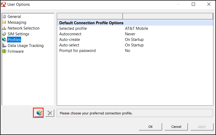 - At the main screen, select the correct APN Profile from the drop-down list, and then tap Connect. (If the green button says "Disconnect" you are connected.)